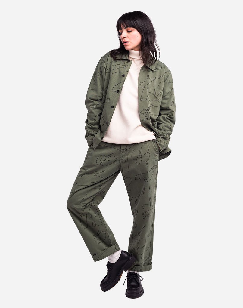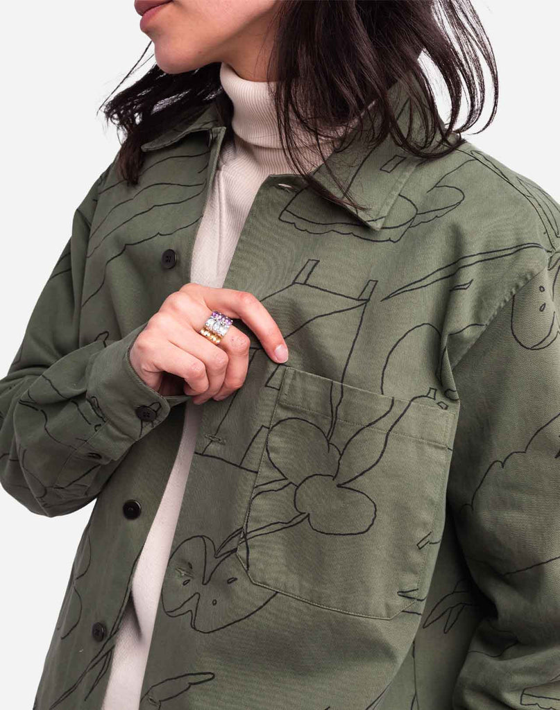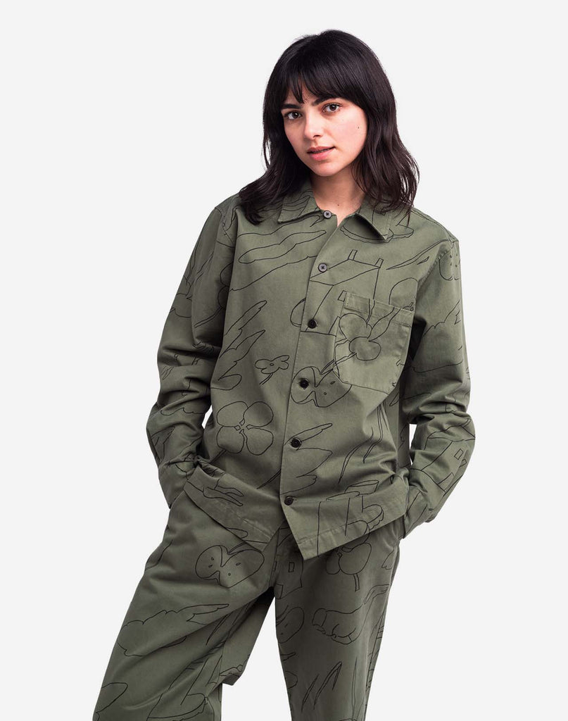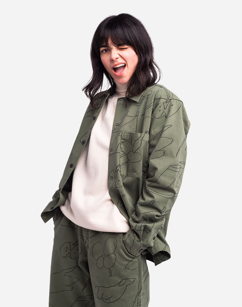 Gabrielle Monceaux's fine line, screen-printed on this shirt (or overshirt, as you prefer), to be worn alone or over a t-shirt. Add to this its large chest pockets, definitely a piece that adapts to any season and any circumstance.