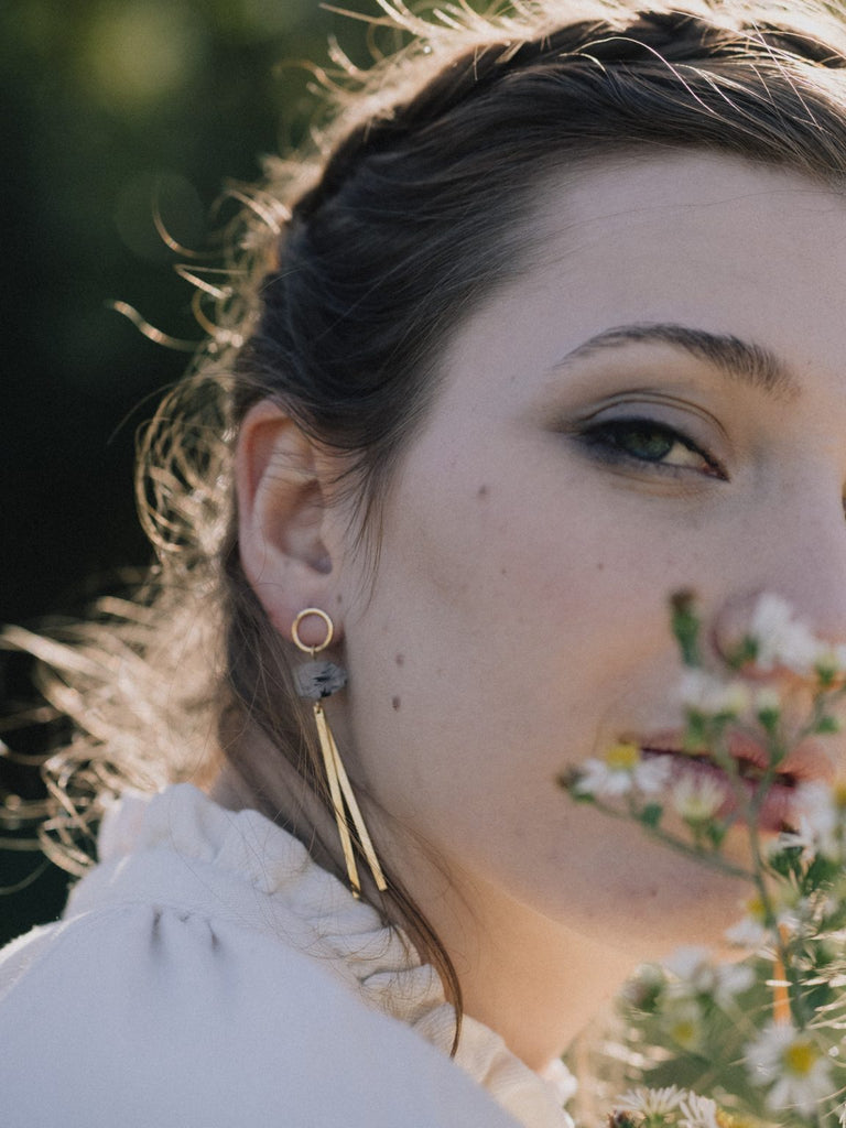 Los pendientes Afrodita combinan dorado y piedras naturales en dos variedades de cuarzo: Cuarzo Rosa y Cuarzo Turmalinado. Las piedras que hemos elegido para este diseño están talladas manualmente con un facetado irregular que hace que cada piedra sea única.