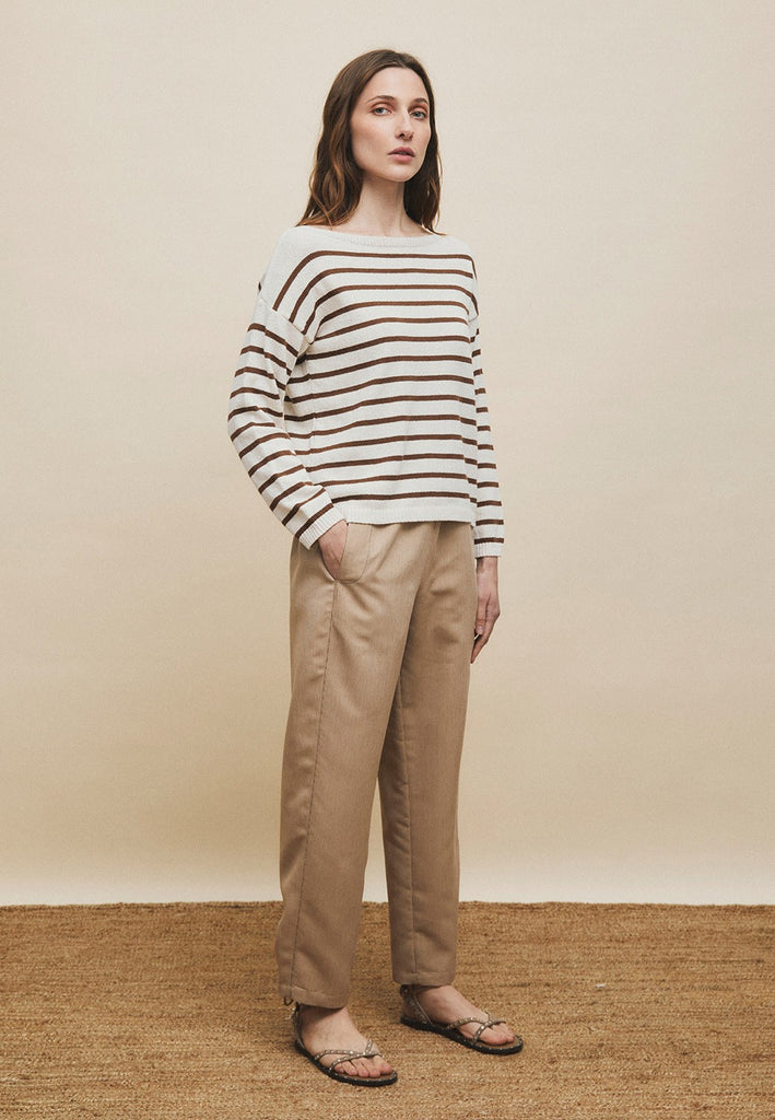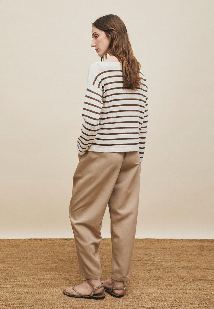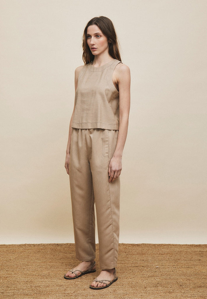Modelo "balloon", cinturilla engomada y bolsillos insertados en costuras laterales.