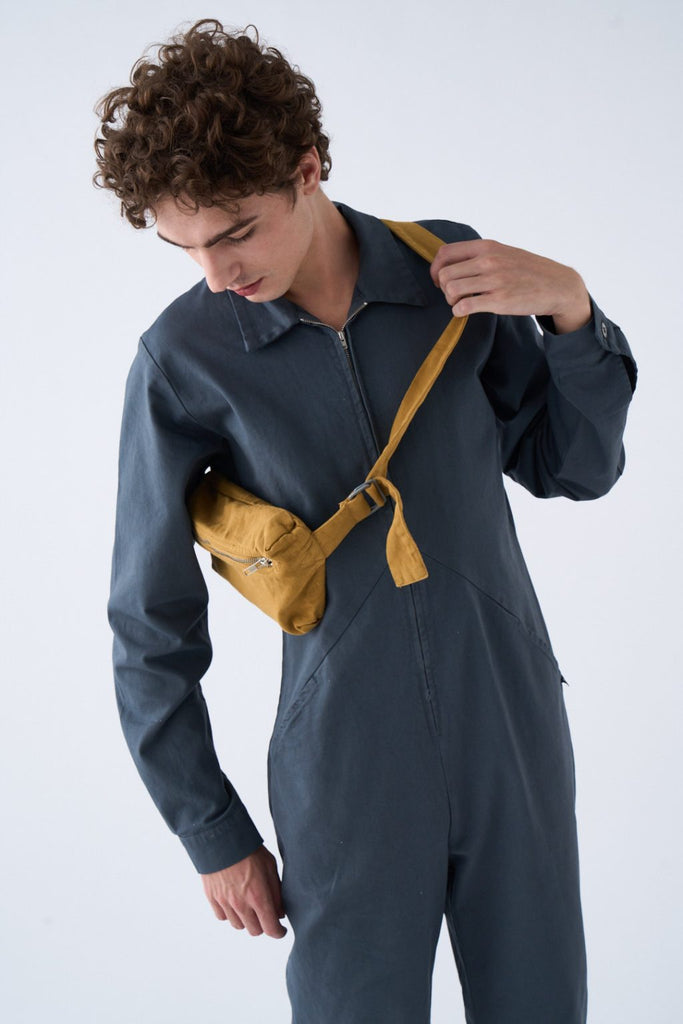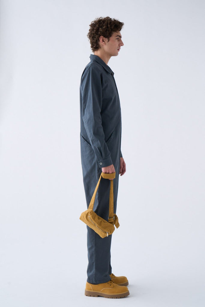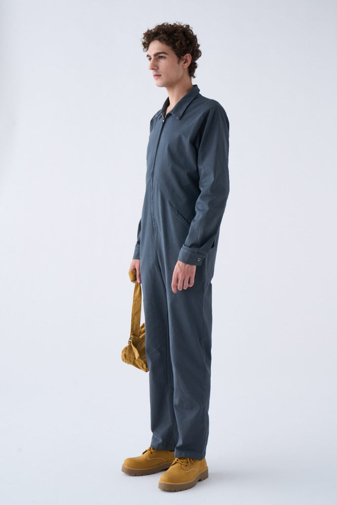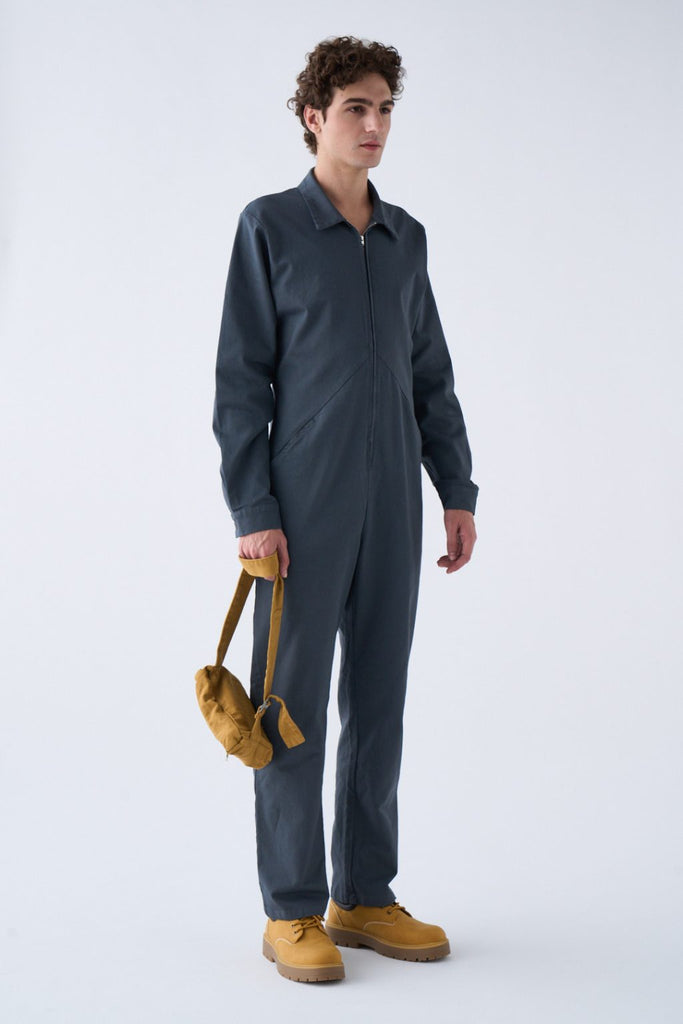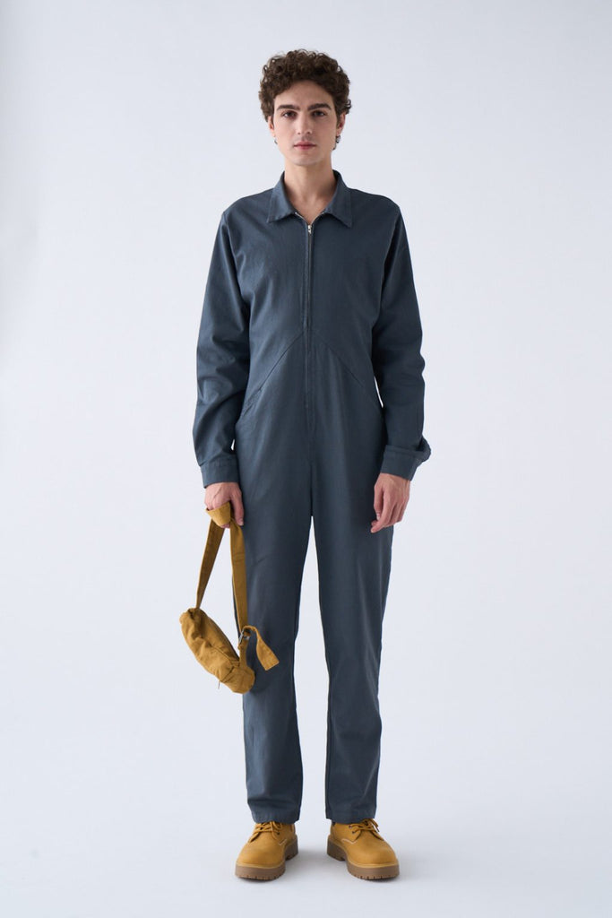 Hay días en los que quieres salir en peto y otros en los que prefieres algo más cerrado, pero igual de cómodo. Ahí entra el mono. Mismo espíritu relajado, misma sensación de libertad, pero con manga larga y una cremallera metálica que sube hasta el cuello de camisa. Lo abres, lo cierras, lo llevas como quieres. Sin botones que molesten ni ajustes innecesarios, solo una pieza pensada para acompañarte sin estorbar. Y, por supuesto, con el mismo corte limpio, bolsillos escondidos y actitud minimalista que hace que vestirlo sea tan fácil como vivirlo.